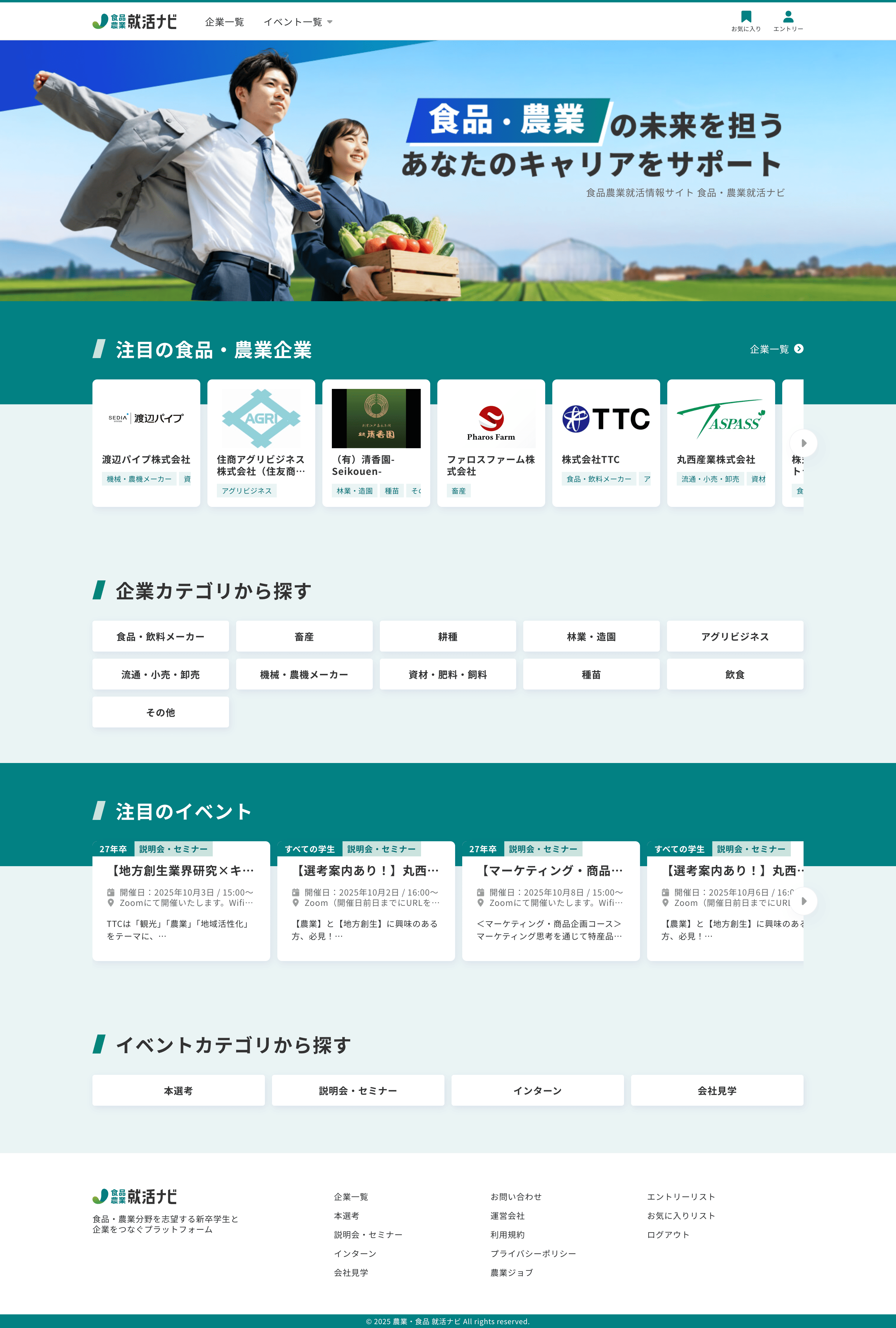 リアルで話ができるイベントに加えて、日程・時間に縛られず、早期から業界理解・企業と学生が出会える場を提供したいという想いから、「食品・農業就活ナビ」をリリースする運びとなりました。