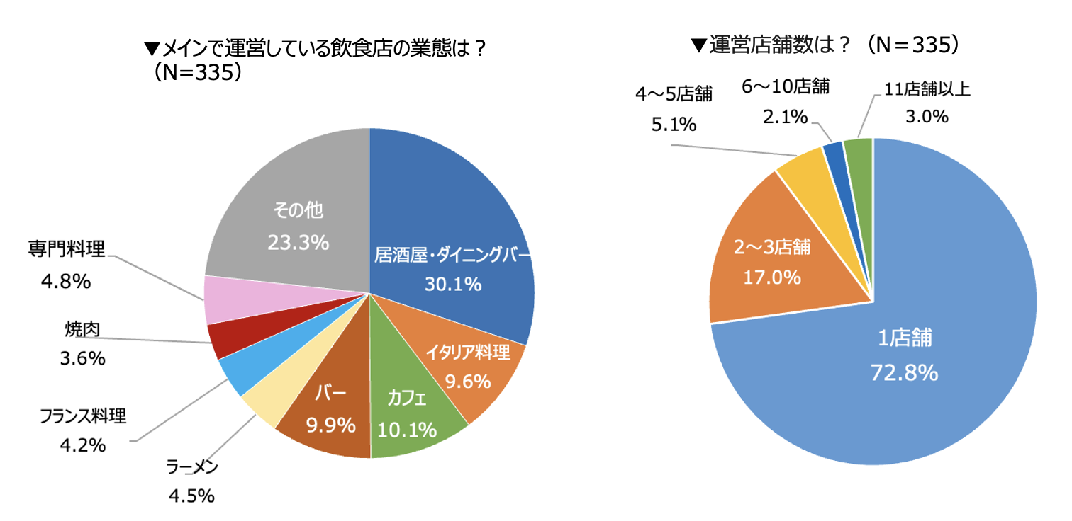 本調査にご協力いただいた回答者のうち、72.8%が1店舗運営となっており、店舗の業態は、居酒屋・ダイニングバーを筆頭に多彩に分散しています。また、東京にある飲食店の割合は50.4%(首都圏の飲食店の割合は67.8%)となっています。これらの背景が結果に影響していると推測されます。