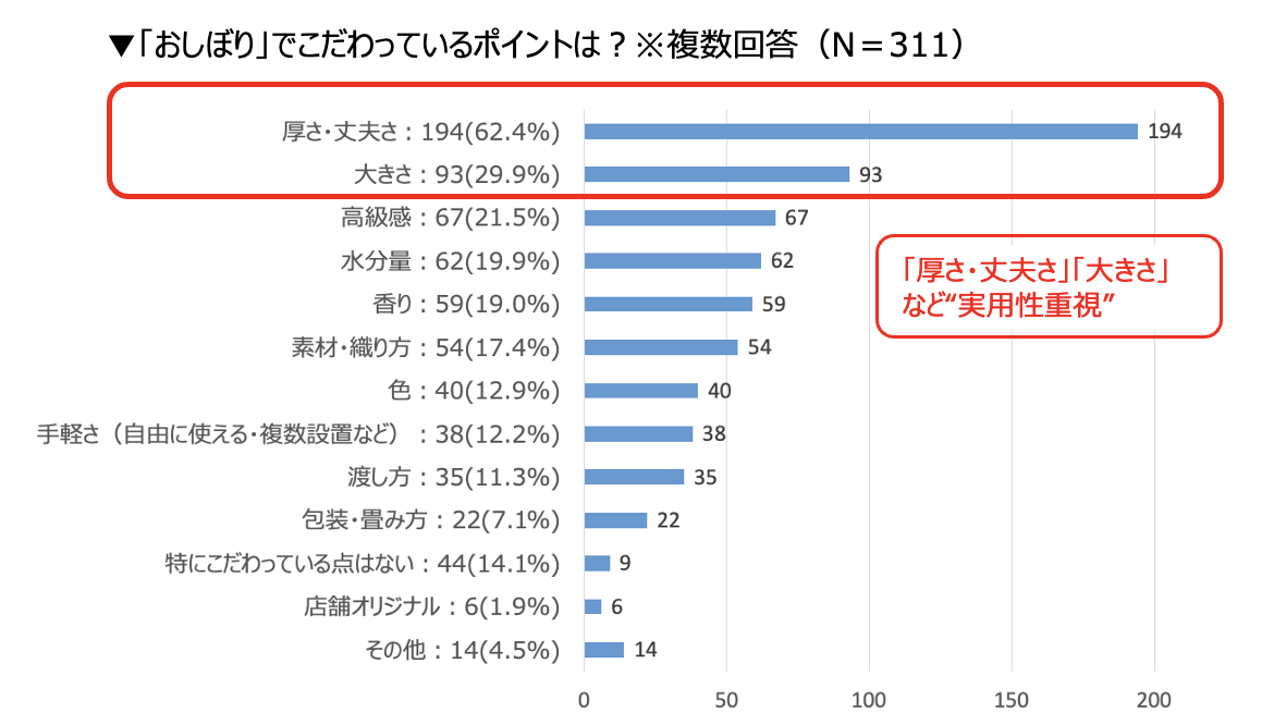 「おしぼりのこだわりポイント」、最多は「厚さ・丈夫さ」