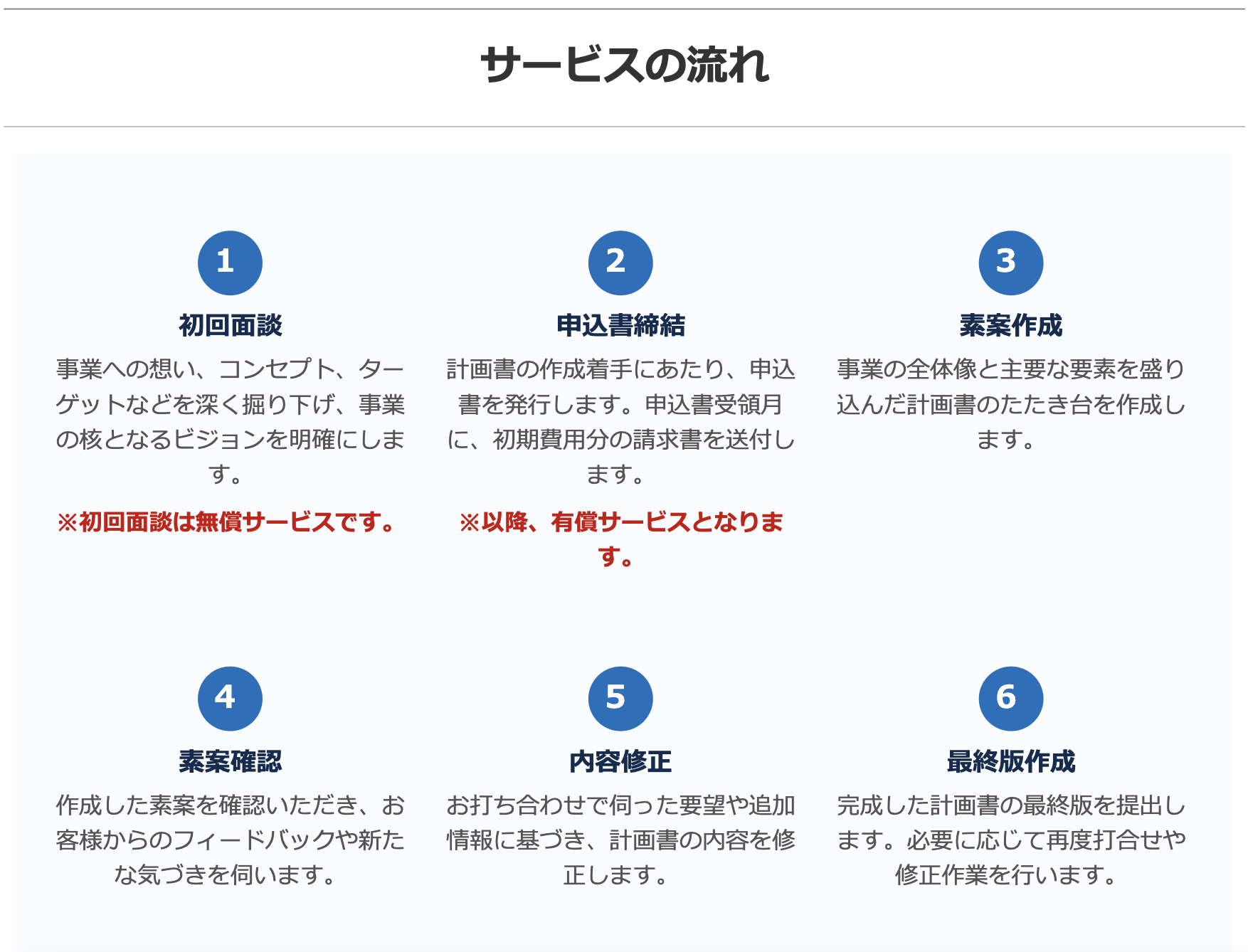 本サービスは、公庫融資などの申請に際して求められる事業計画の作成を支援するものです。ヒアリングを通じて、店舗コンセプトに合わせた「市場・競合分析」「コンセプト・店舗設計」「数値計画策定」などをサポートし、日本政策金融公庫フォーマットの創業計画書や、当社オリジナルの店舗計画書を作成します。