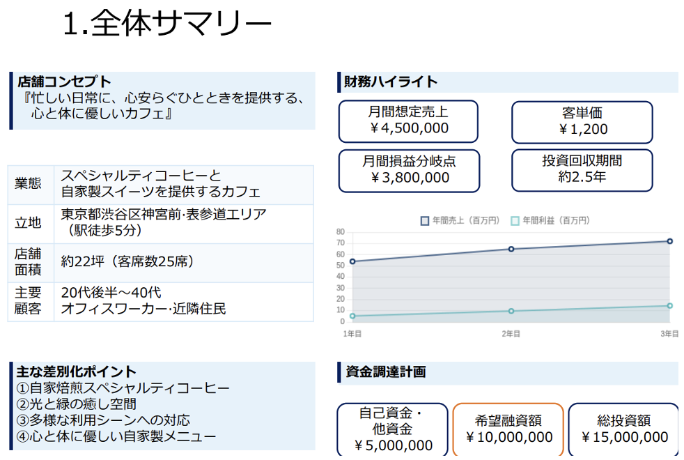 本サービスは2025年8月から提供開始し、同年12月よりサービス紹介ページを公開しました。初案件となる創業融資は、申請額900万円の満額で実行されています。実際の融資申請まで一連で伴走したことで、開業準備段階での情報整理や計画策定の課題が明らかになりました。利用者(東京でのバル業態開業希望者)からは、「初めての開業で不明点が多い中、地域情報や競合、数値計画を具体化できた」といった声が寄せられており、開業前段での計画支援に対するニーズが確認できます。