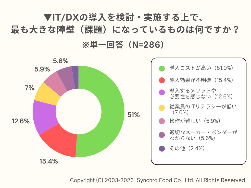 こうした現状に対し、過半数の経営者が「人手不足・長時間労働の解決にIT/DXは重要(ある程度含む)」と認識しています。しかし、導入の最大の障壁となっているのは「導入コストが高い(51.0%)」ことだ。原材料費の高騰(Q13で51.0%が課題と回答)が経営を圧迫する中、新たなコスト増には慎重にならざるを得ない実情があることがわかります。