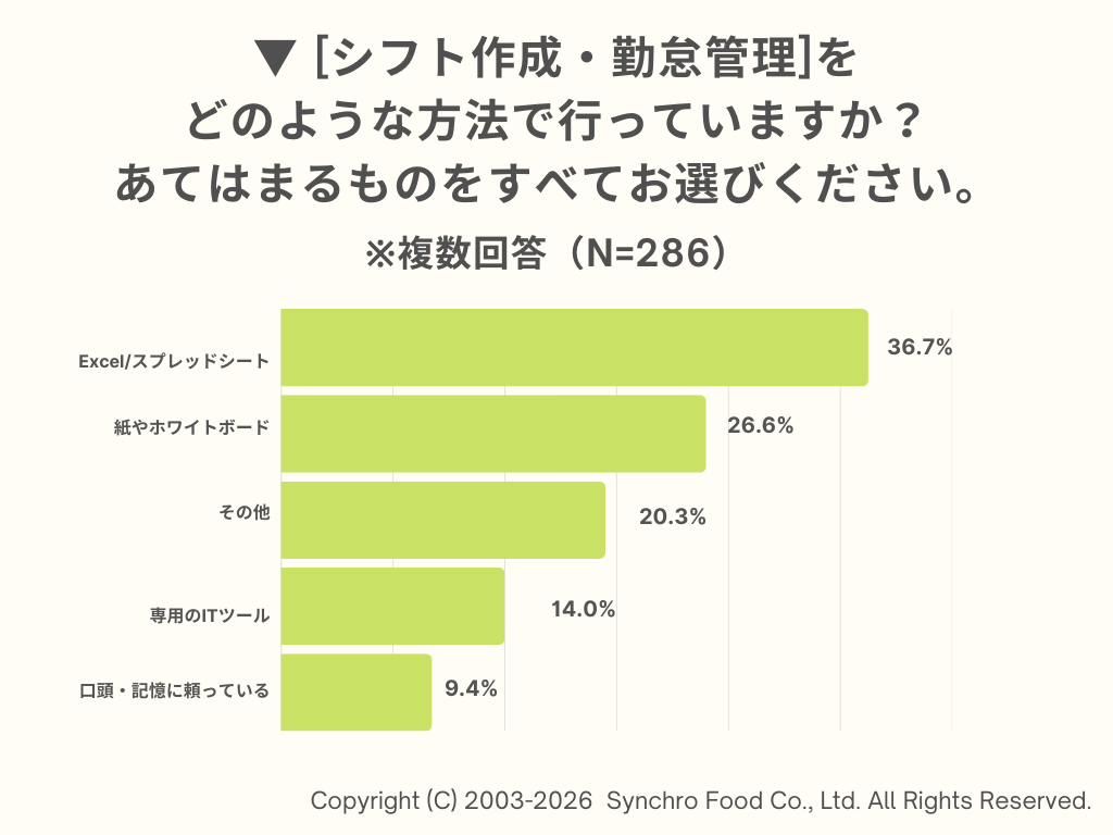 「シフト作成・勤怠管理」においては、「Excel/スプレッドシート(36.7%)」と「紙やホワイトボード(26.6%)」が主流で、「専用のITツール」の利用は14.0%にとどまりました。