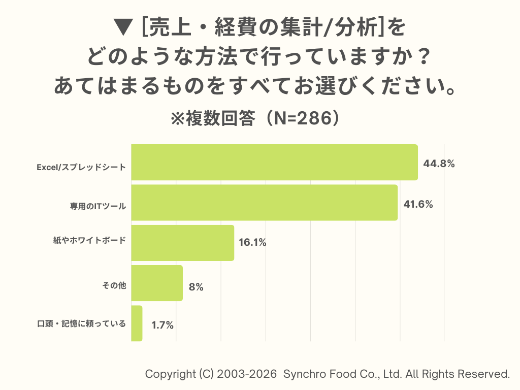 一方で、「売上・経費の集計/分析」に関しては、「専用のITツール(41.6%)」と「Excel/スプレッドシート(44.8%)」が拮抗する結果になりました。