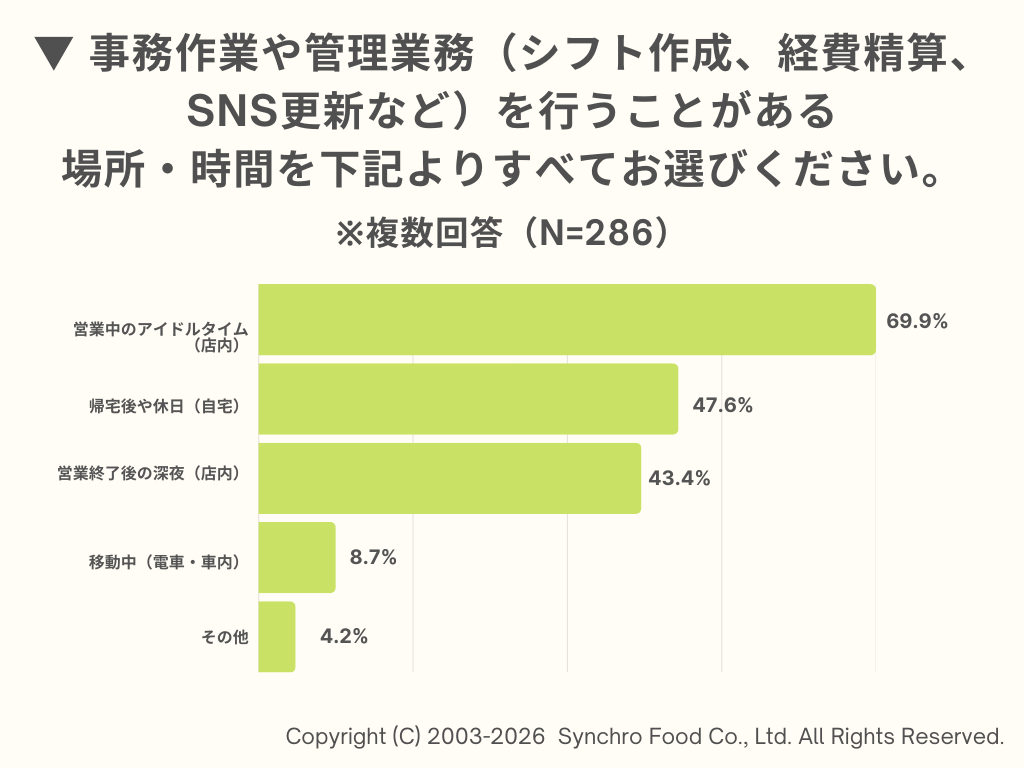 こうしたアナログ管理の負担は、経営者の私生活をも浸食しています。事務作業を行う場所・時間を聞いたところ、「営業中のアイドルタイム(69.9%)」に次いで、「帰宅後や休日(47.6%)」、「営業終了後の深夜(43.4%)」という回答が多く挙がりました。