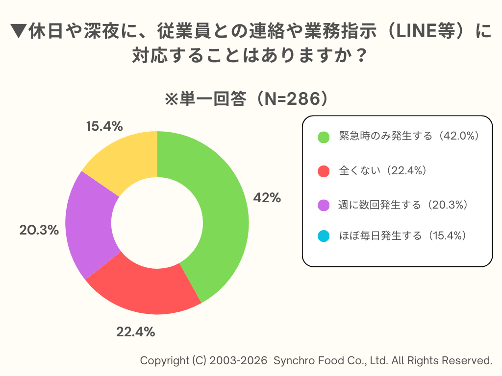 また、休日や深夜に従業員からの連絡に対応することがあるかという問いには、約35%が「毎日〜週数回発生する」と回答。店舗にいなくとも業務から離れられない「隠れた長時間労働」が常態化していると言えます。