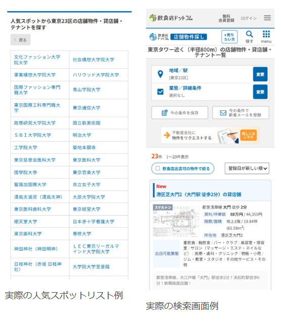 飲食店向け店舗物件情報サイト「飲食店ドットコム・店舗物件探し」(https://www.inshokuten.com/)を運営する株式会社シンクロ・フード(本社:東京都渋谷区、代表取締役:大久保俊、東証プライム市場:3963)は、2026年2月16日より、特定のランドマークや施設周辺から物件を検索できる新機能「人気スポットから物件を探す」機能を提供開始しました。本機能により、「東京タワー近く」や「大学近く」といった具体的なスポットを指定し、その地点から徒歩10分圏内(半径約800m圏内)にある店舗物件をスムーズに一覧表示することが可能となります。
