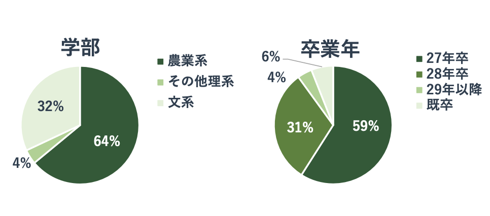 来場学生は、農業系学部の学生が64%を占めるなど、食品・農業業界への関心が高い層が中心となりました。一方で、文系学生も32%来場しており、専門領域に限らず幅広いバックグラウンドの学生が参加しています。