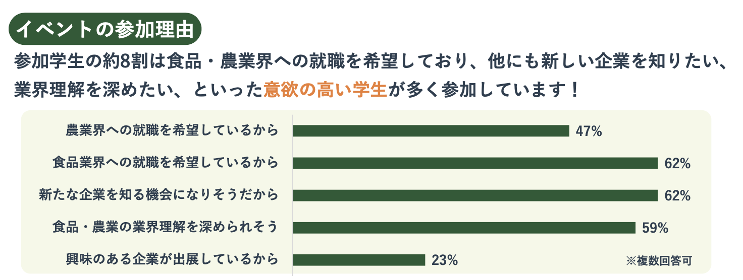 また、参加理由としては、「食品業界への就職を希望しているから」(62%)、「農業界への就職を希望しているから」(47%)に加え、「新たな企業を知る機会になりそうだから」(62%)、「食品・農業の業界理解を深められそう」(59%)といった回答も多く、志望度の高い学生に加え、比較検討や情報収集を目的とした学生も多く来場していることがうかがえます。