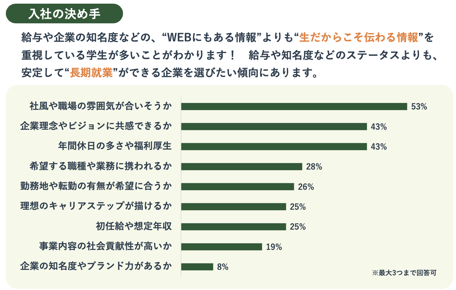 企業選びの基準として最も多かったのは「社風や職場の雰囲気が合いそうか」(53%)で、次いで「企業理念やビジョンに共感できるか」「年間休日の多さや福利厚生」がともに43%となりました。一方、「企業の知名度やブランド力があるか」は8%にとどまり、条件面や知名度だけでなく、対面で得られる情報を重視する傾向が見られます。